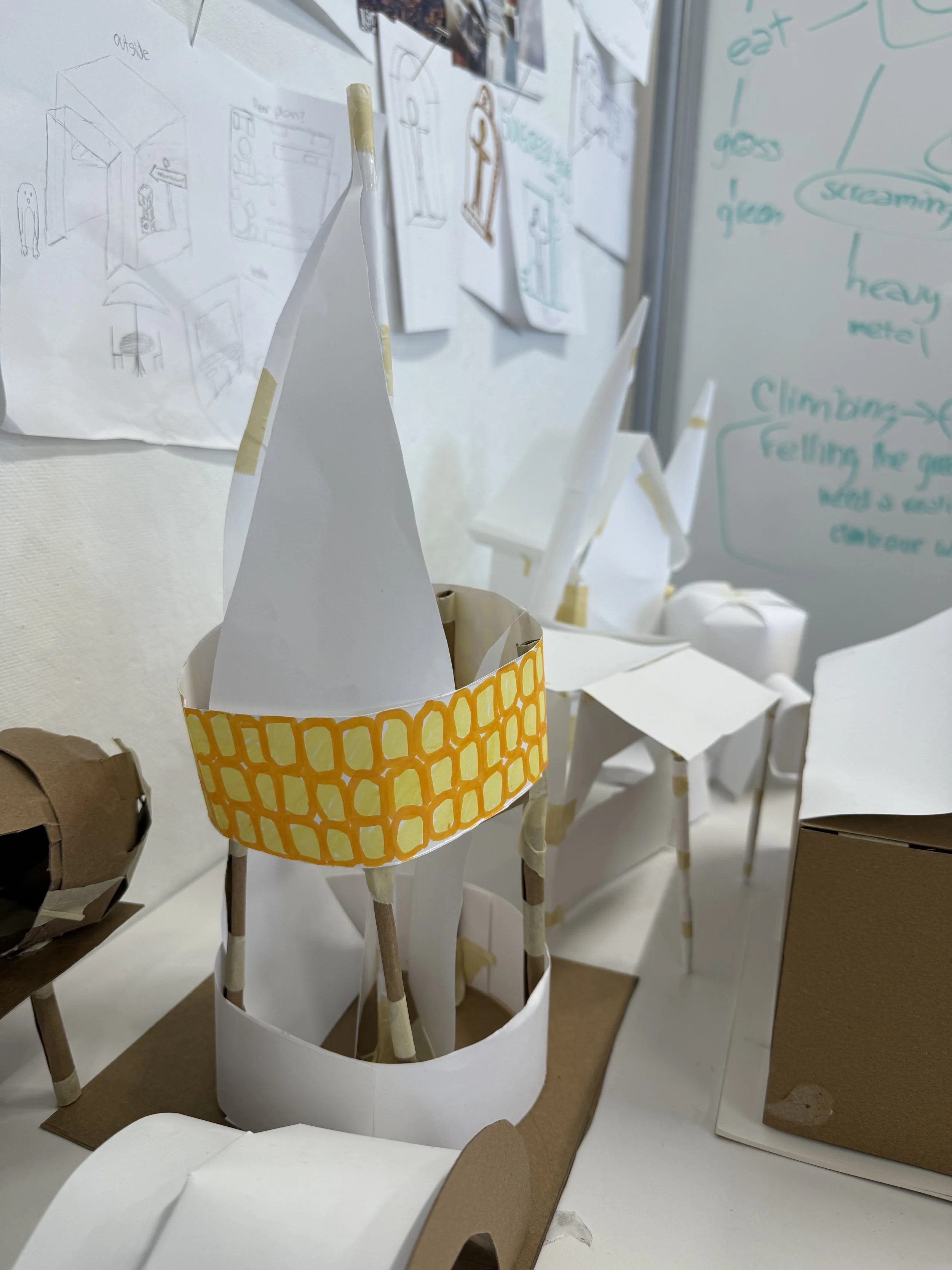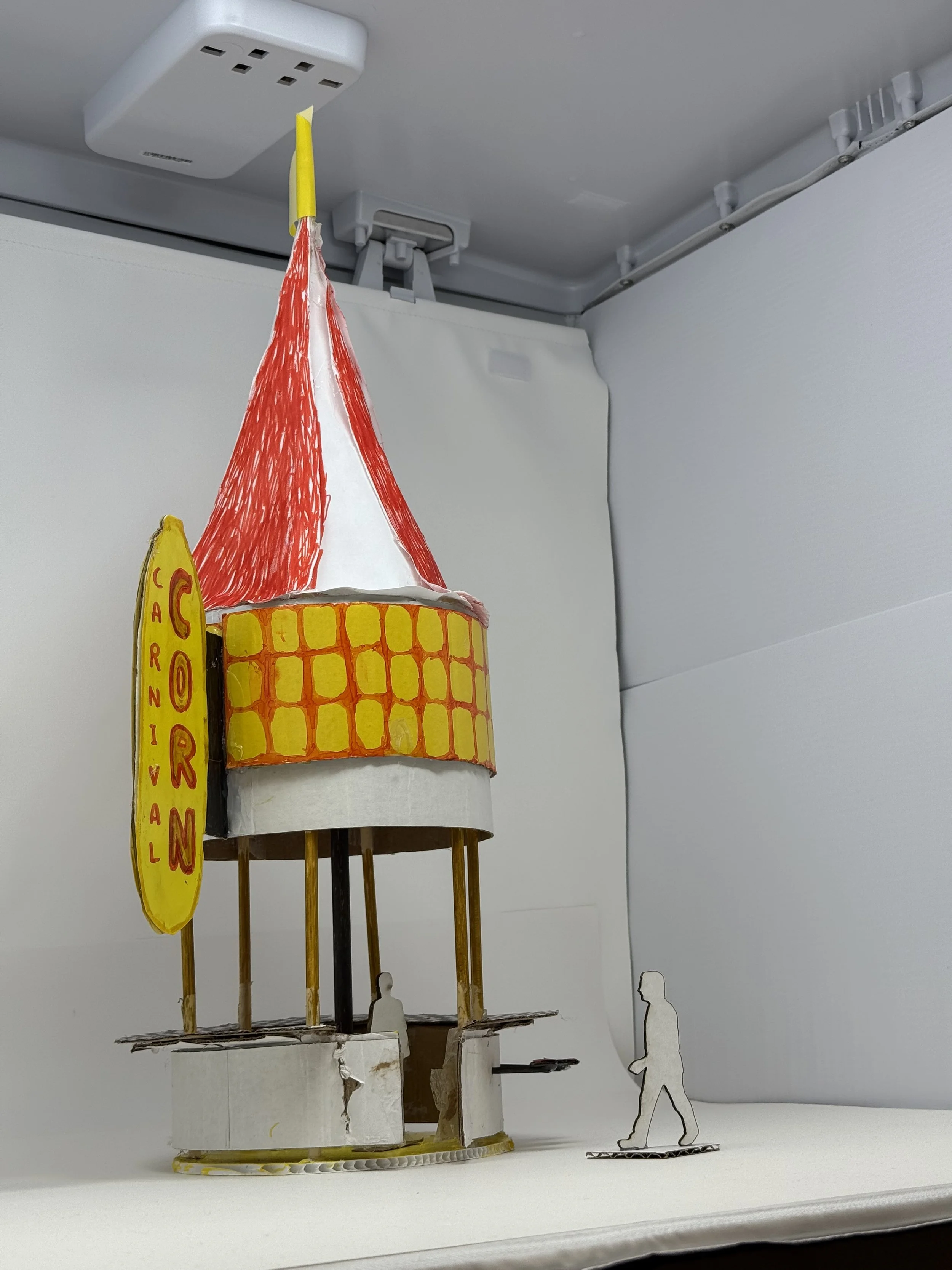 Built from cardboard, chipboard, dowels, tape, and marker, the model explores a kit-of-parts that can flat-pack, bolt together quickly, and be re-skinned each season. The playful graphic language is intentional: it collapses brand, wayfinding, and shelter into one legible figure, echoing the vernacular of fairgrounds where buildings are characters in the street.