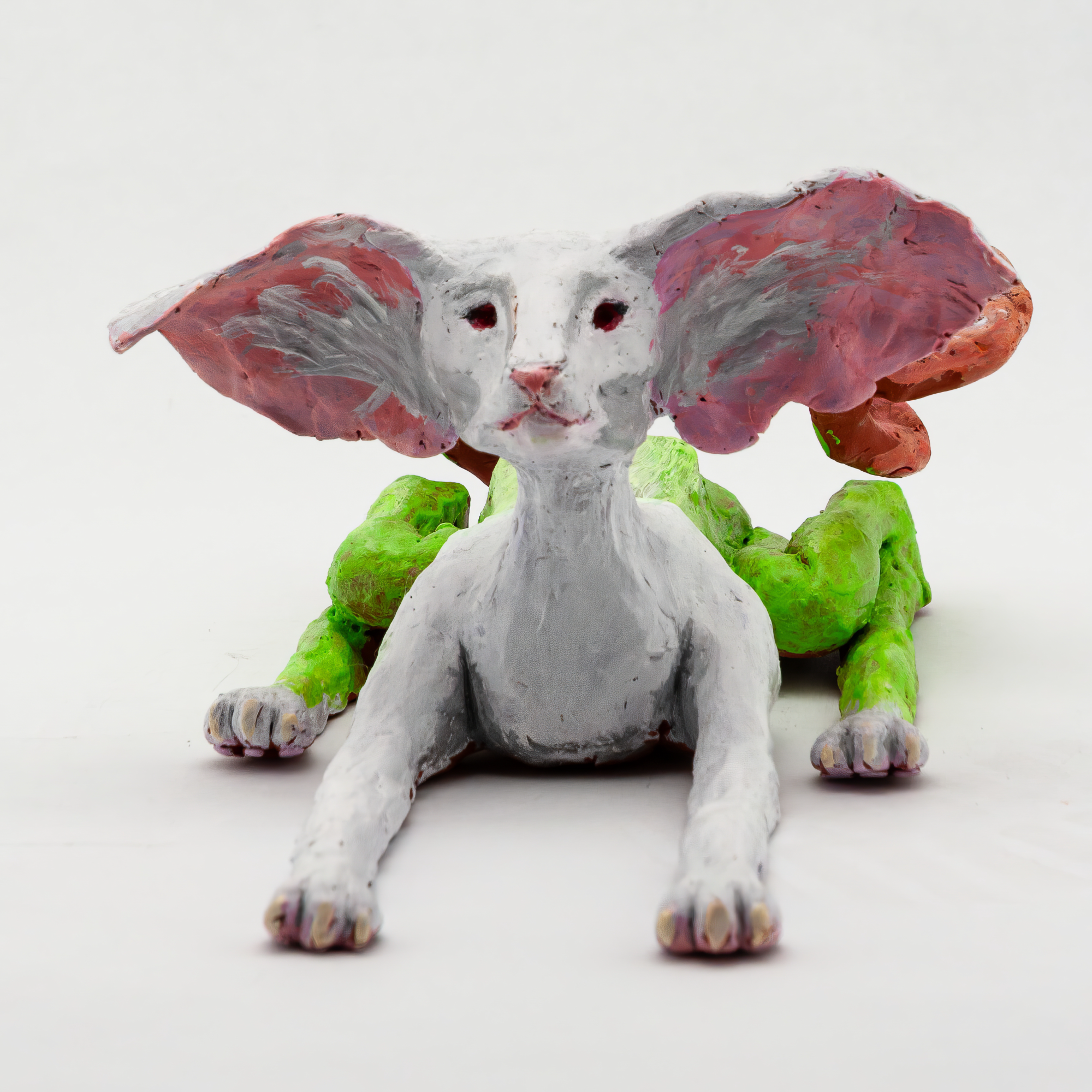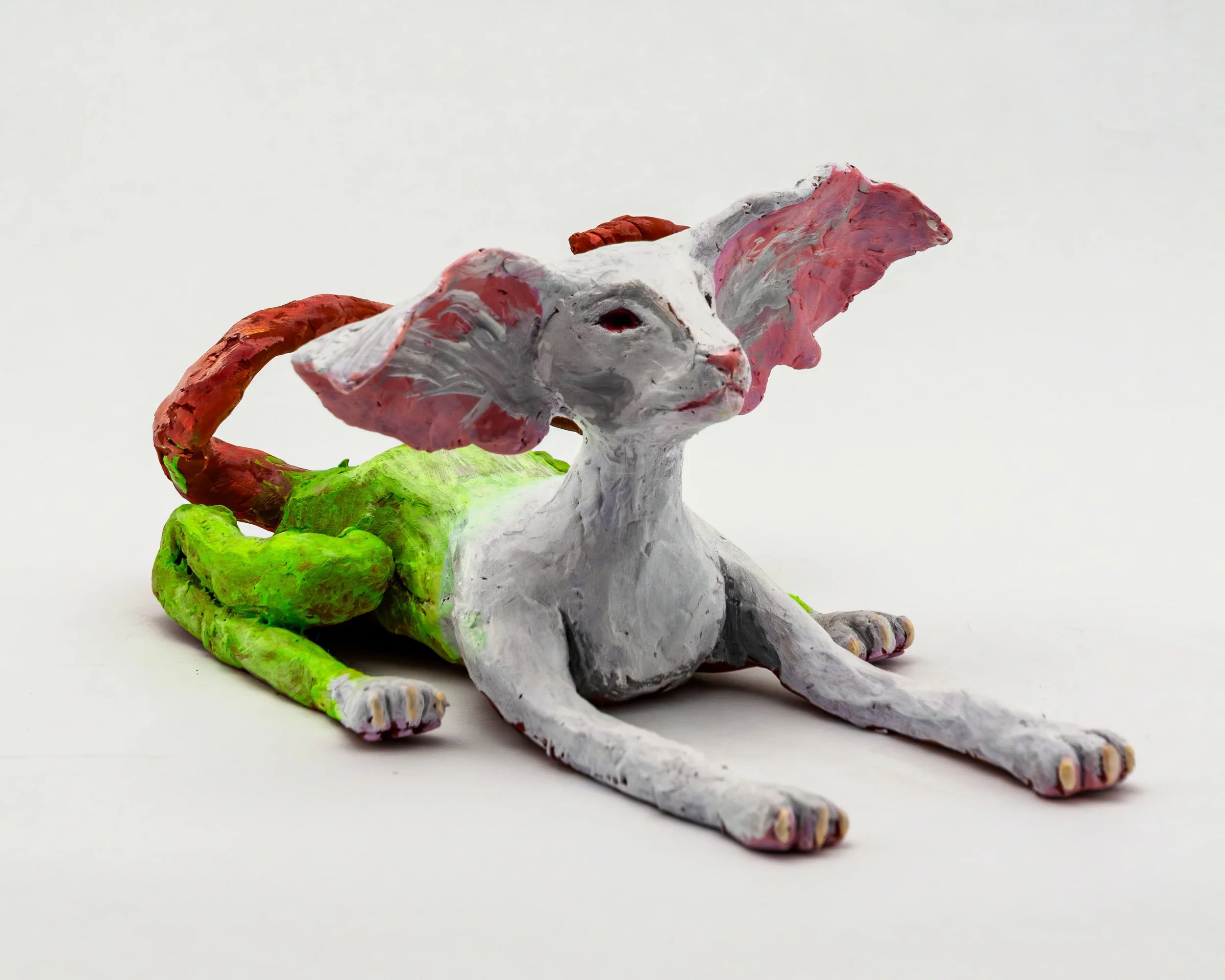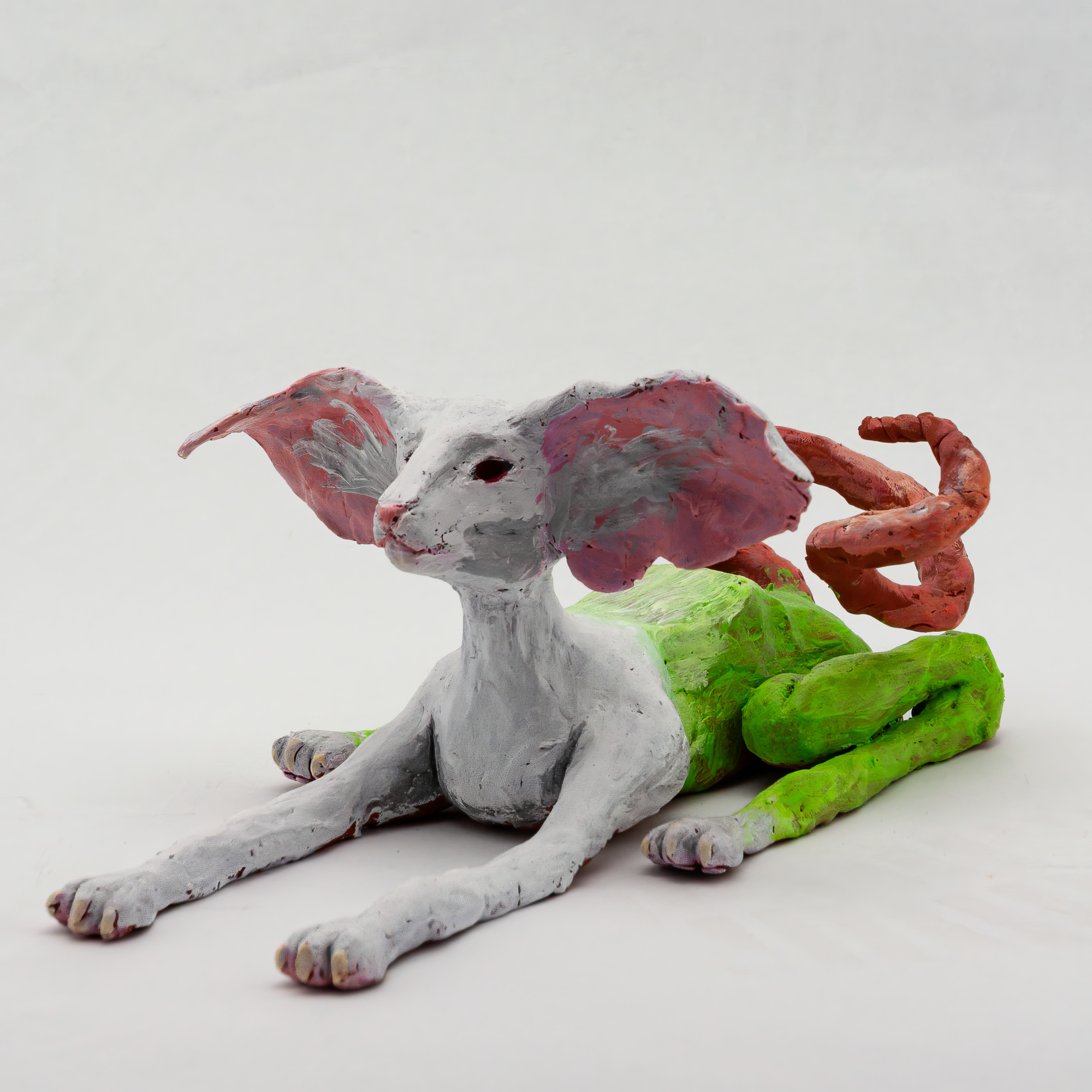 This sculpture, Gargoyle, draws inspiration from the mythical protectors found on cathedrals, which blur the boundary between animal and architecture. I wanted to capture both the playfulness and the watchfulness of a guardian figure by inventing a creature that feels both familiar and otherworldly. The exaggerated ears, elongated body, and curling tail push the form into abstraction while still suggesting movement and alertness.