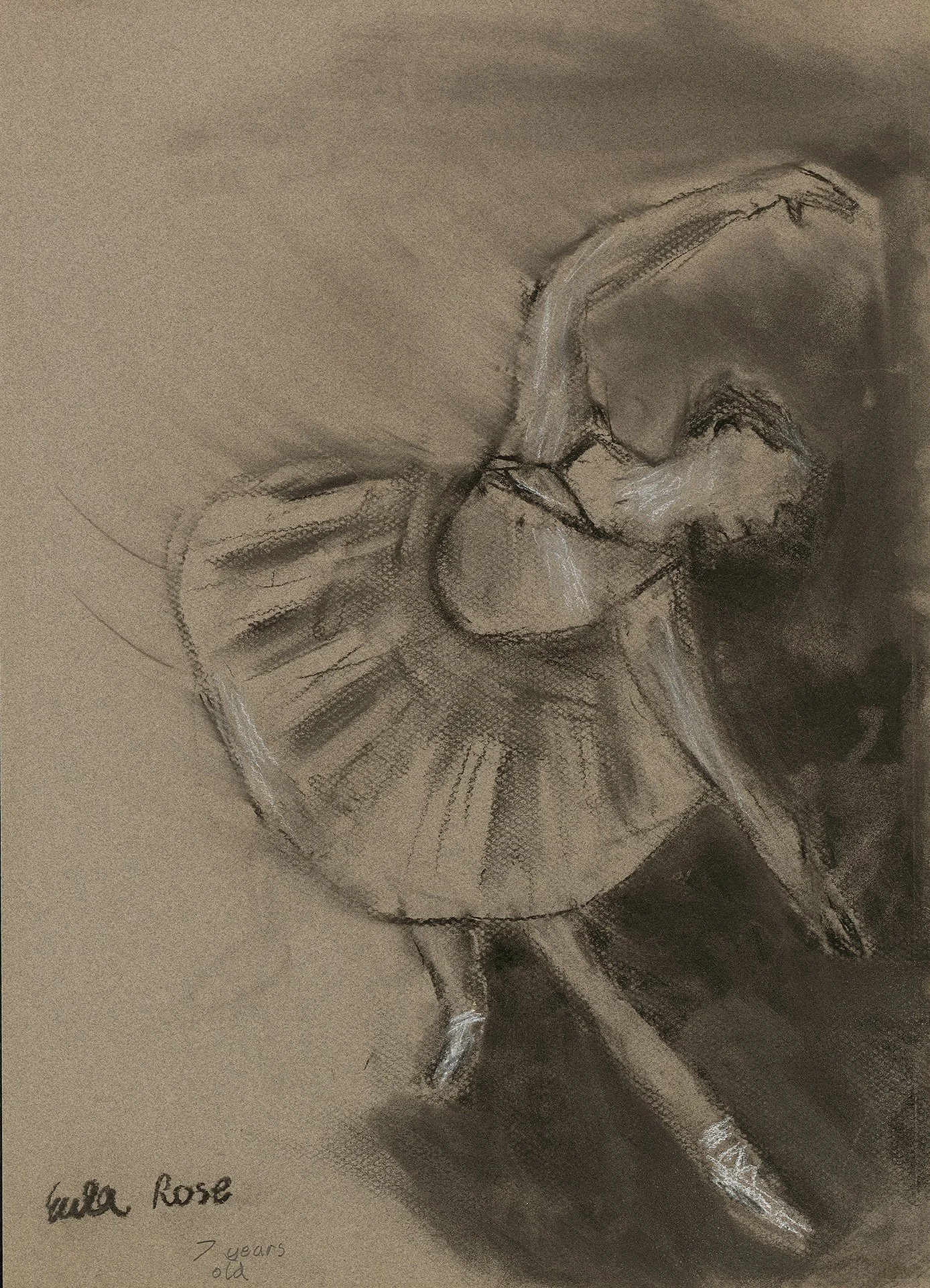 This piece was created when I was seven, while studying Edgar Degas’ ballet dancers. Even at that age, I was drawn to the challenge of showing motion in a still image. I experimented with soft charcoal shading and dynamic lines to suggest rhythm and elegance. While it reflects the influence of Degas, it also marks an early step in my own artistic journey—learning how to see not just the figure, but the feeling of dance.