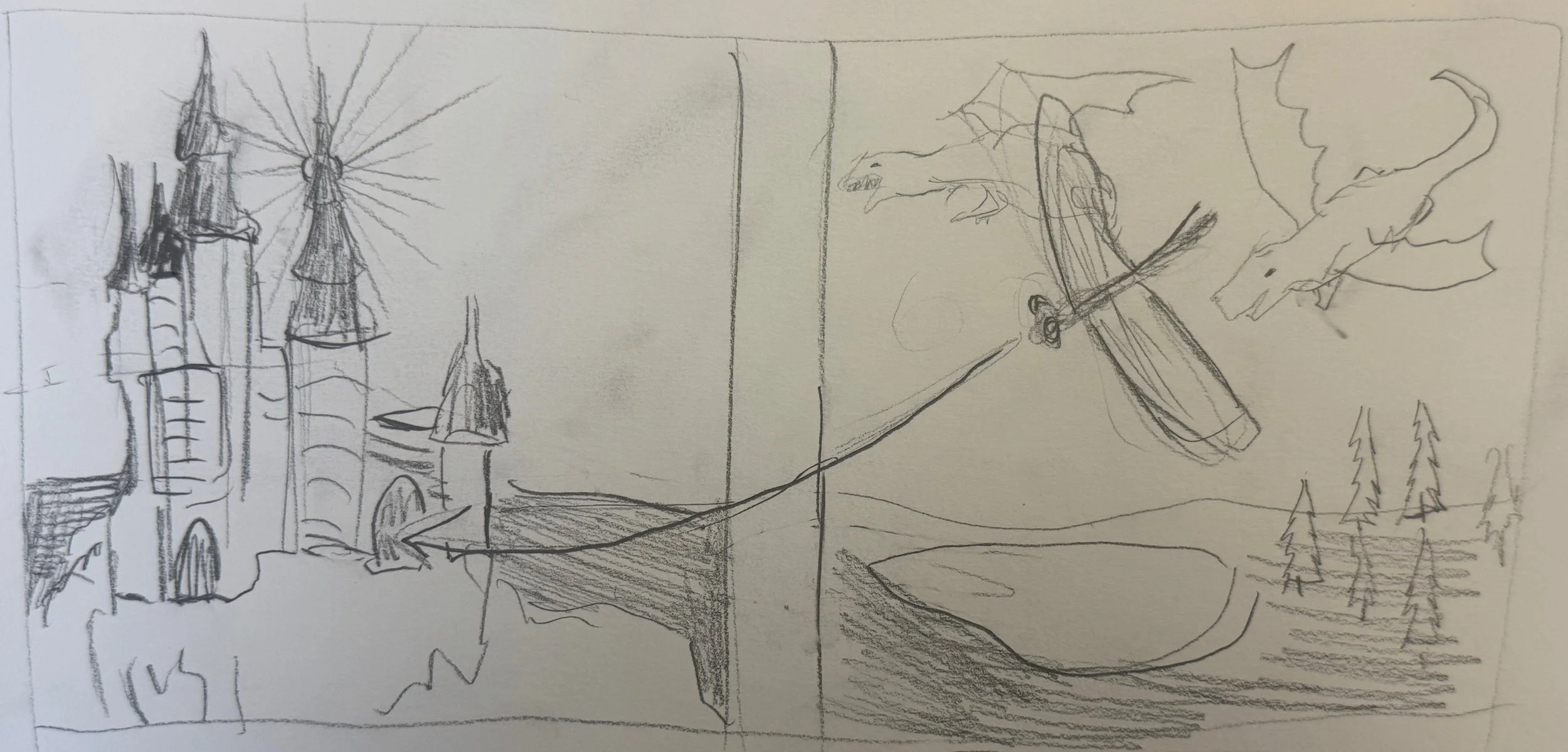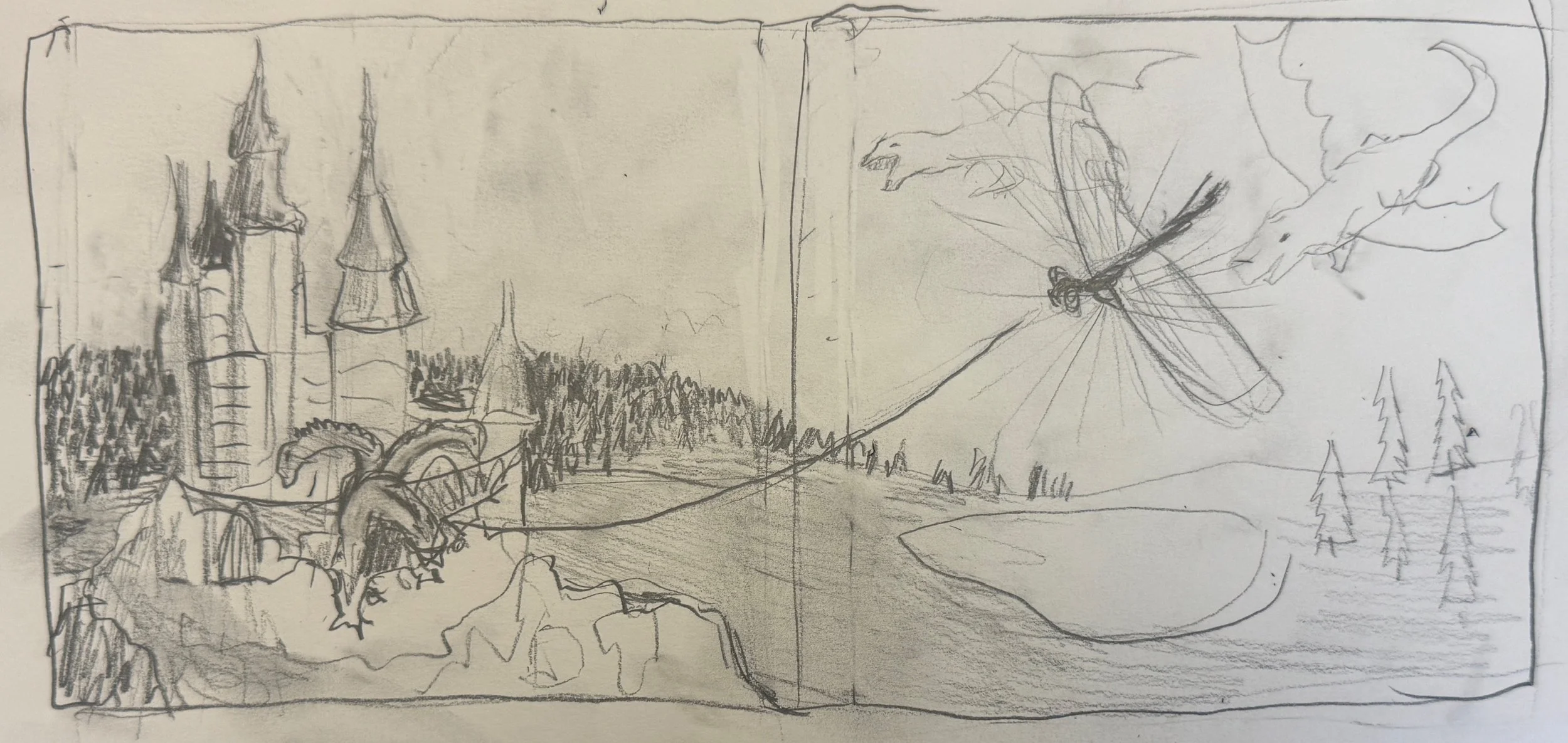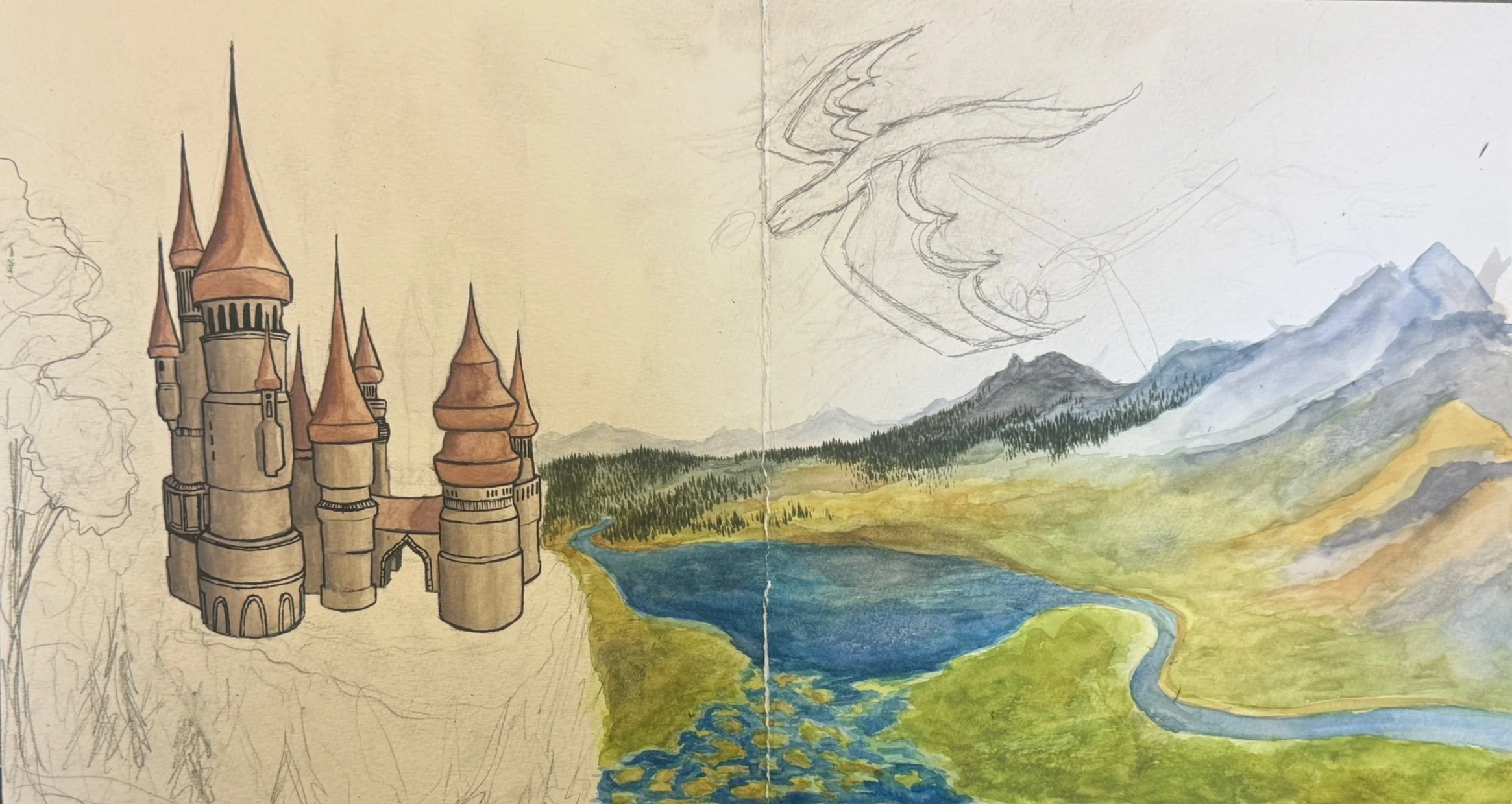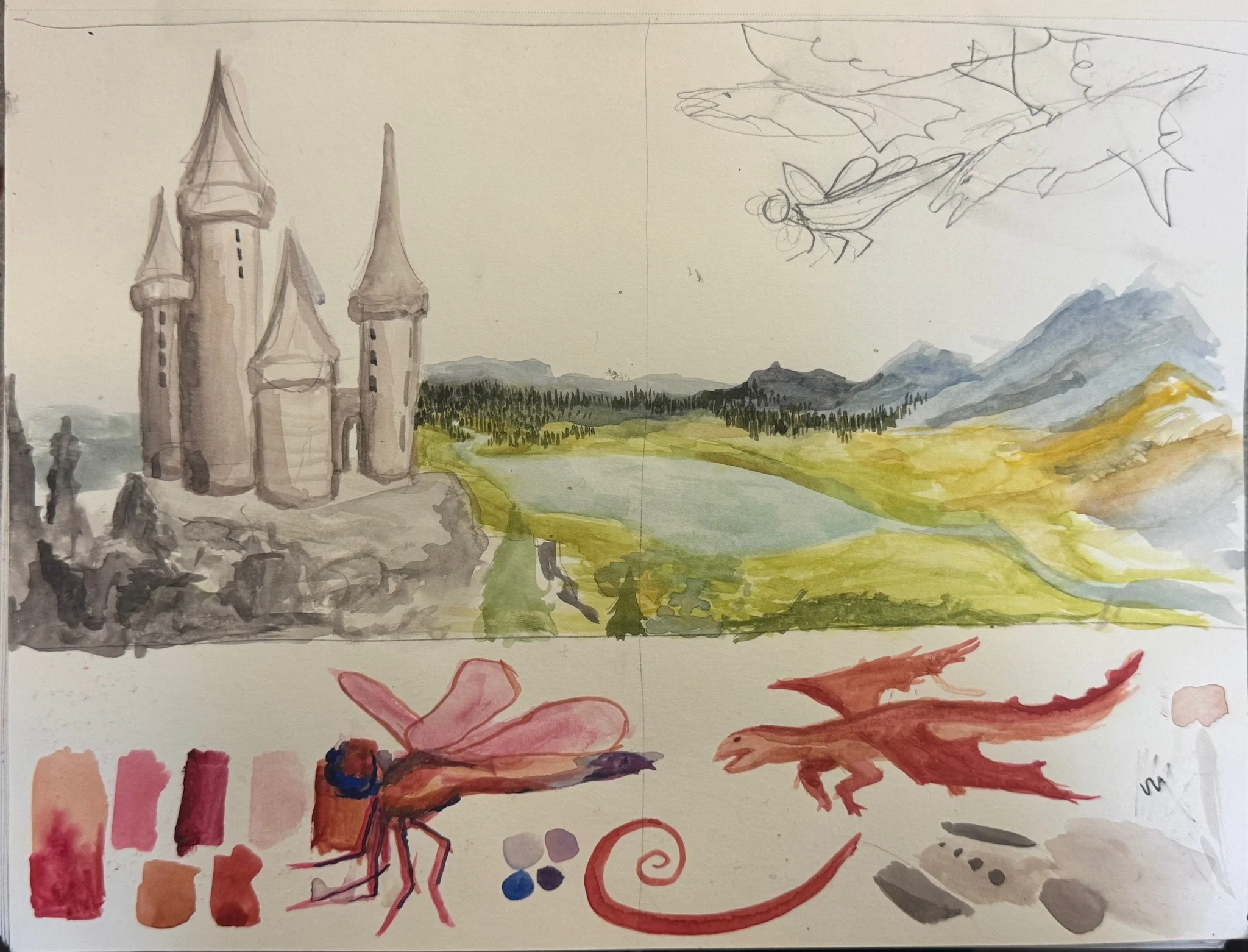 First, I iterated with several test sketches to determine what composition and colors I wanted for my dragons, dragonfly, castle, and landscape, considering and refuting the idea of a 3-headed dragon and a light behind the castle instead of the dragonfly. Then, I created a final sketch and painted the watercolor landscape, making the foreground colors more vibrant and the background less so with lower opacity to show distance. I changed the castle design it in order to add a 2-tiered roof and adjust the perspective to fit with a mid-castle height perspective. After inking it and painting it, I added in the orange tree on the left to match the castle coloring, add contrast, and create a more engaging zoomed-in perspective. Then, I spent many hours adjusting where I wanted the dragons to be, eventually making them smaller and only two to highlight the importance of the dragonfly.