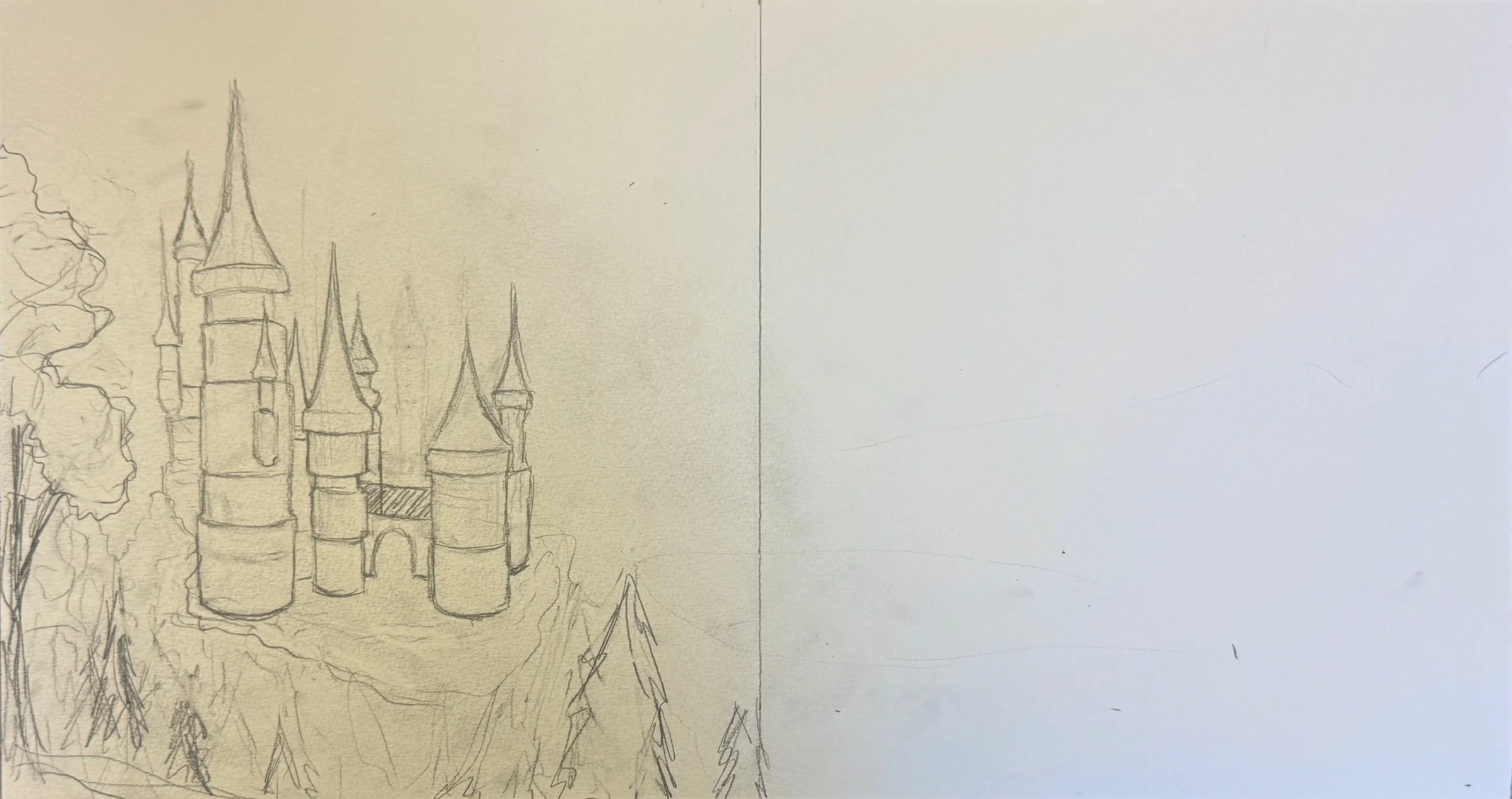 I painted the creatures and the sky blue with clouds and radiating light from the sun, but I thought it was to busy and distracted from the castle, so I lightened it and made it more uniform. Finally, I added deeper values and shadow to the dragons, dragonfly, and castle and wing details with pencil.