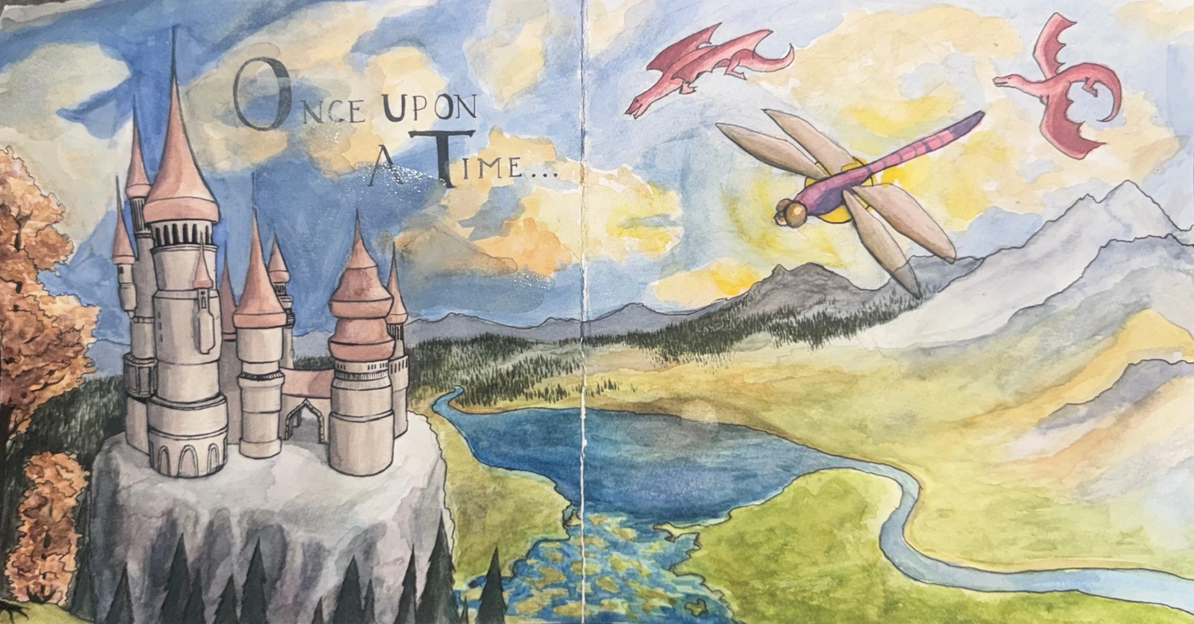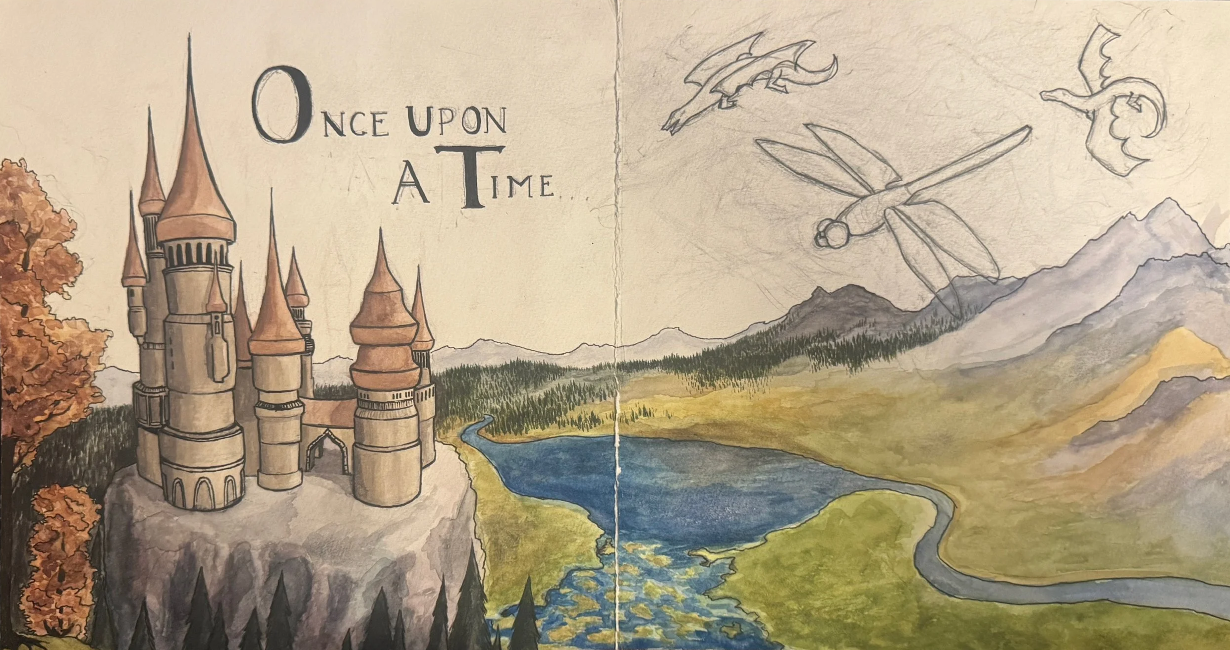 My purpose with this piece was to depict the experience of immersing yourself within fiction media, such as picture storybooks, as a young child. Thus, I decided to format the whole piece like a storybook page, initially deciding to put it within a book (still undecided about that), including a crease in the center to indicate it is a frequently used book, a 2 large, square page format, inked outlines, and fancy lettering of the common “Once upon a time…” story beginning. The dragonfly is meant to represent the reader and how they identify themselves with the characters of the media they consume, becoming what they consume. In contrast, I chose dragons and a dragonfly, to reveal how people also identify with characters because they see themselves in them. The dragonfly is radiating light to show how the reader is the one who brings stories to life through their imagination as they “fly in” to the world they read about.