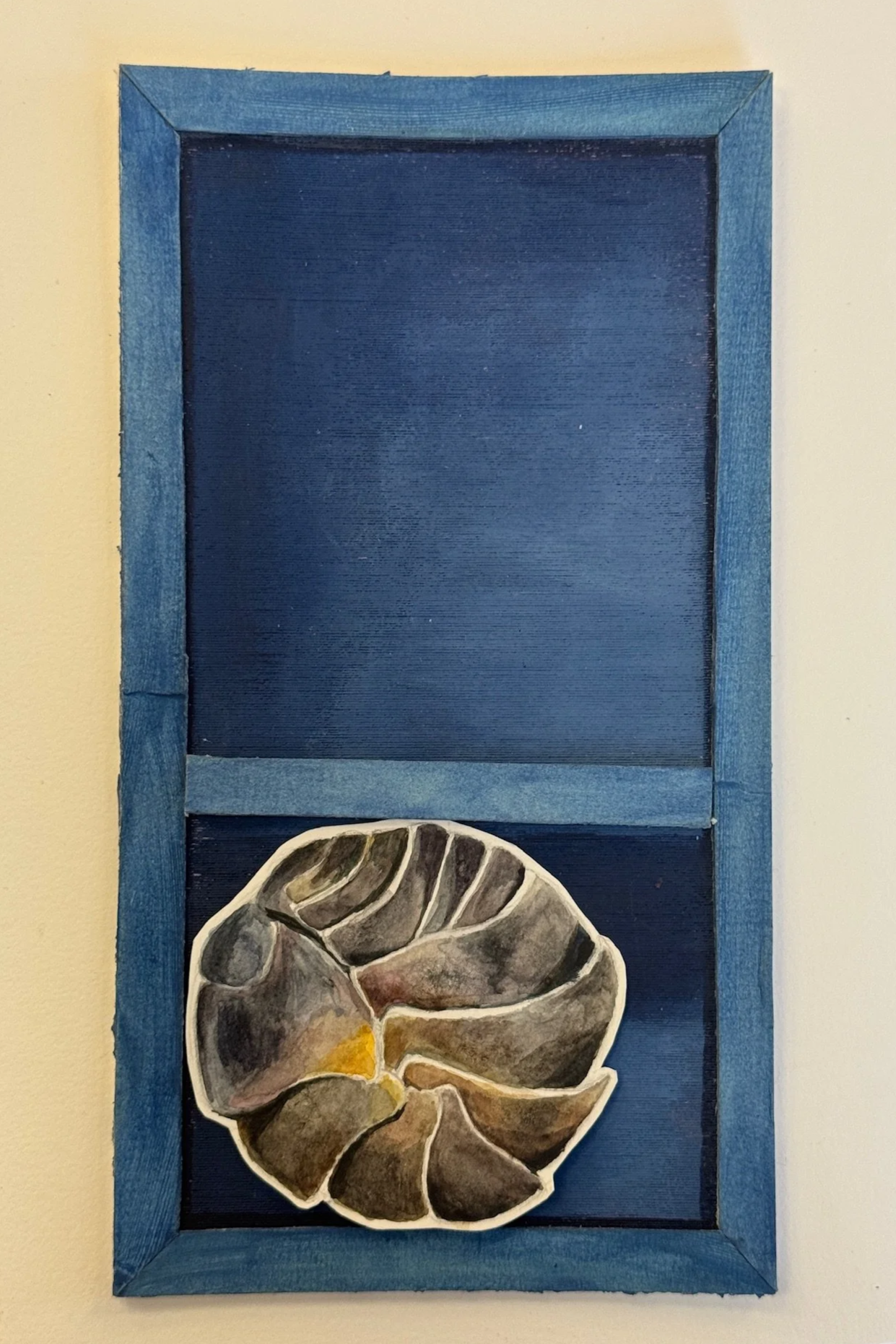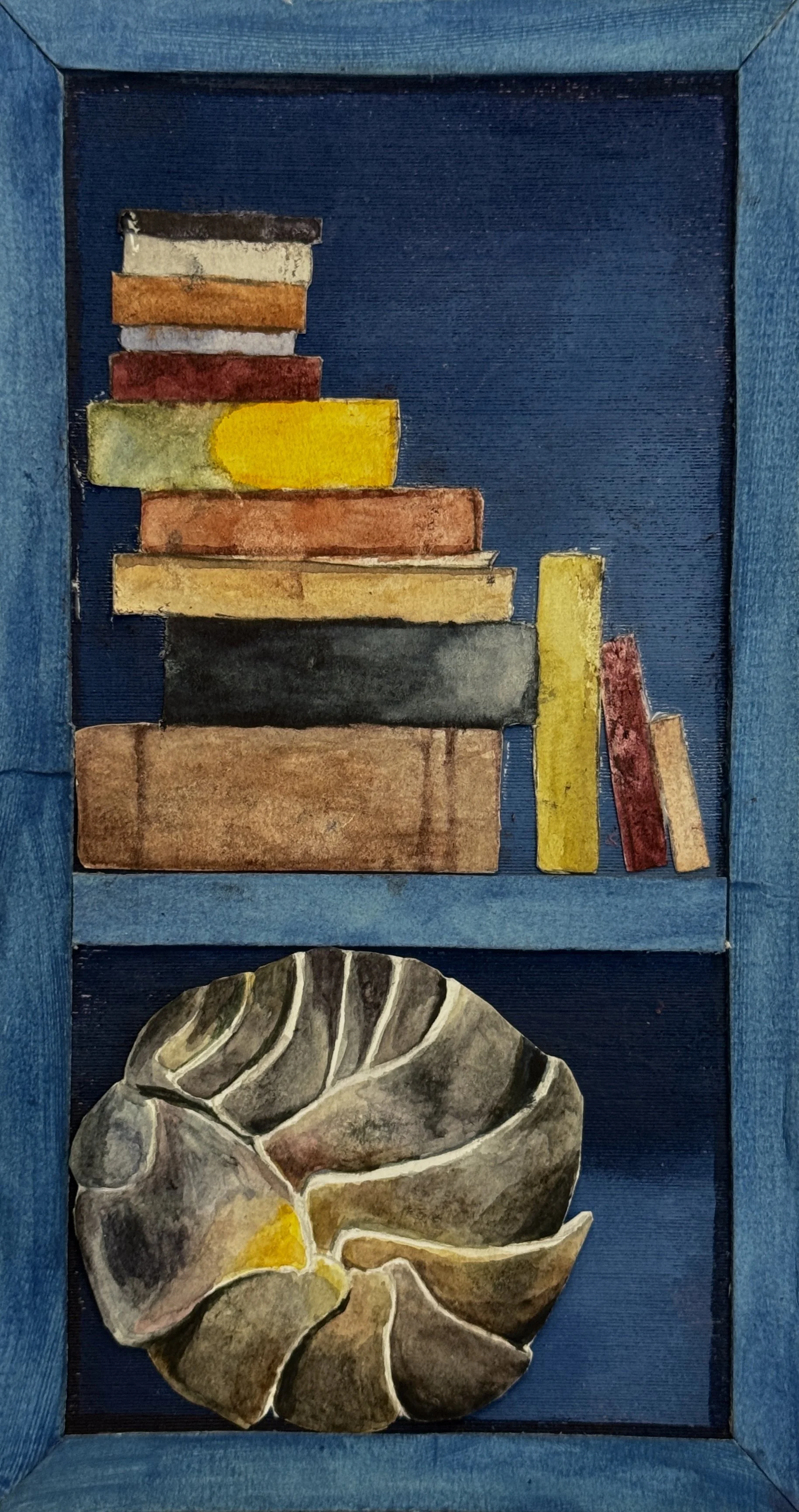 This piece depicts a roly poly, tightly rolled up inside of a locker, to represent how students feel trapped by the pressures of school–such as bullying or academic stress–and how they shut down, creating hard facades, in order to escape. The base is made of layers of textured board material, painted with blue acrylic, to create a greater sense of dimension. The roly poly and stack of school books were painted with watercolor on separate paper and later glued into the locker.