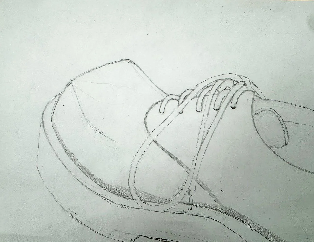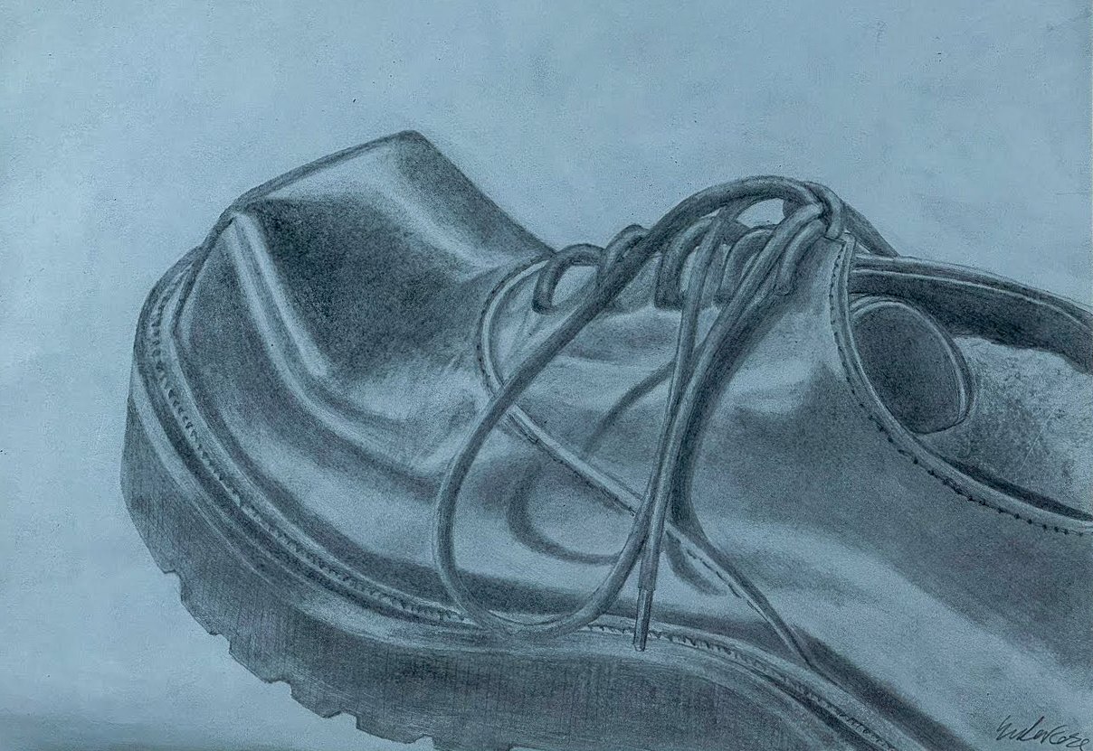 I created this drawing using graphite pencil, focusing on close observation and gradual layering to capture the form and materiality of the shoe. I began with a light structural sketch to establish proportions and perspective, paying close attention to the curvature of the toe, the tension of the laces, and the subtle asymmetries that give the object character. From there, I built up value slowly, working from light to dark to define volume and depth.