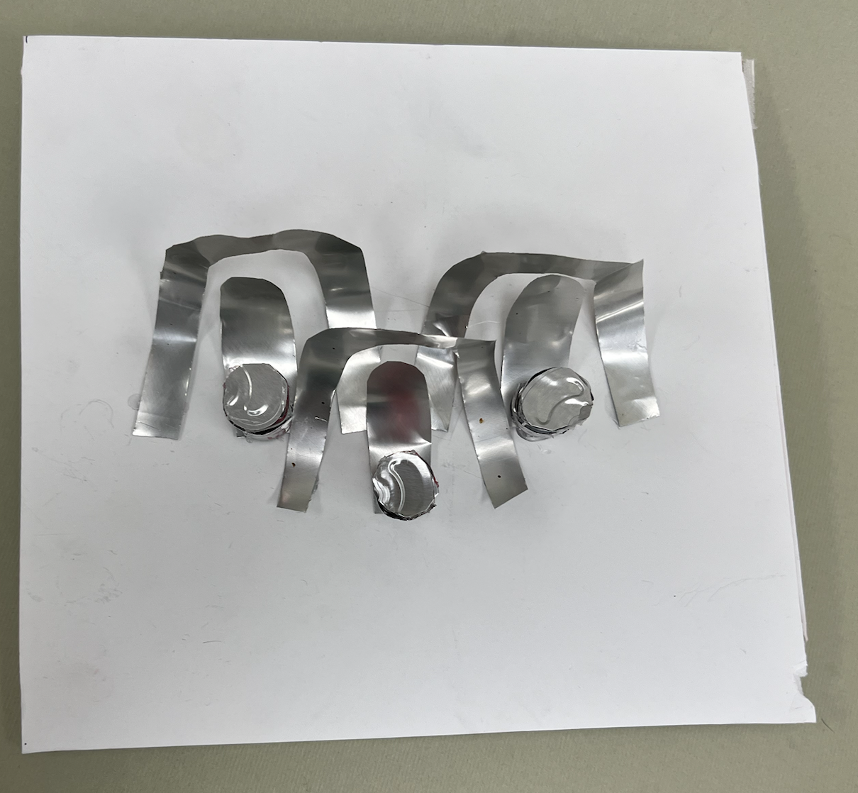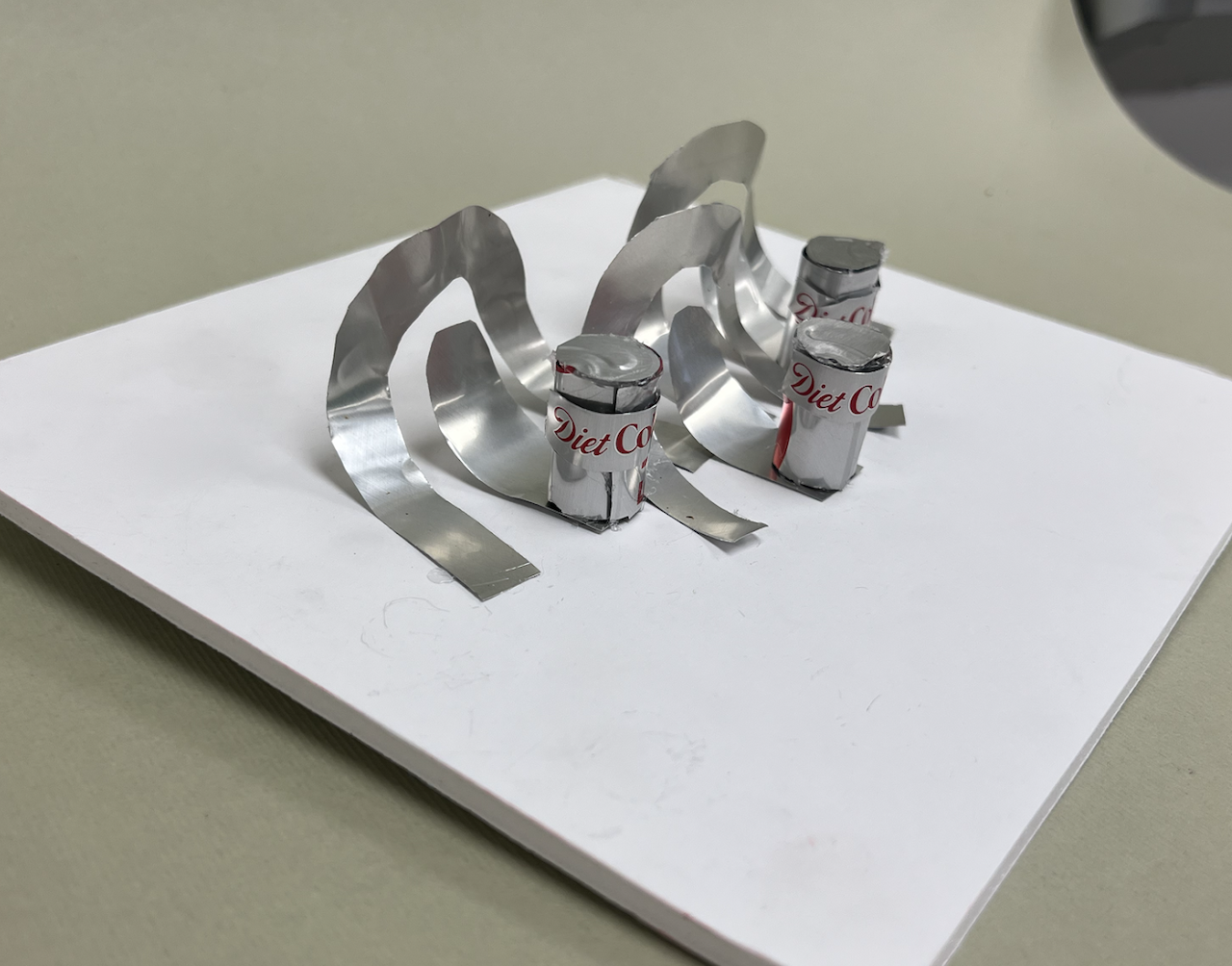 My Pattern Sculpture: The goal of this sculpture was just to display a pattern using our objects. At first, I struggled to create/choose a pattern because there were just so many possibilities. I considered a checkerboard-type pattern, as well as a triangular pattern, however, I settled on this unique design incorporating mini Coke cans. I just love creating mini sculptures, so I had the idea to use the mini labels on the Coke cans to create three mini versions. I referenced the first Nifty-Niner I created by creating a kind of wave in the pattern. The pattern repeats this form: rainbow-like arches surrounding a door-shaped piece (both of which are bent to create a wave shape), on each one mini Coke can stands. These forms, in my opinion, nestle together to form a pattern that resembles a series of waves, or a tsunami. One thing I enjoyed and think I did well was creating the mini Coke cans. Mini things are so fun to create, and I think they turned out adorable and neat. And from a distance, they even kind of look like normal coke cans. One thing I think I could have done better was maybe repeating this pattern more. If I had more time, I could have continued the pattern which would have created a more complex design.