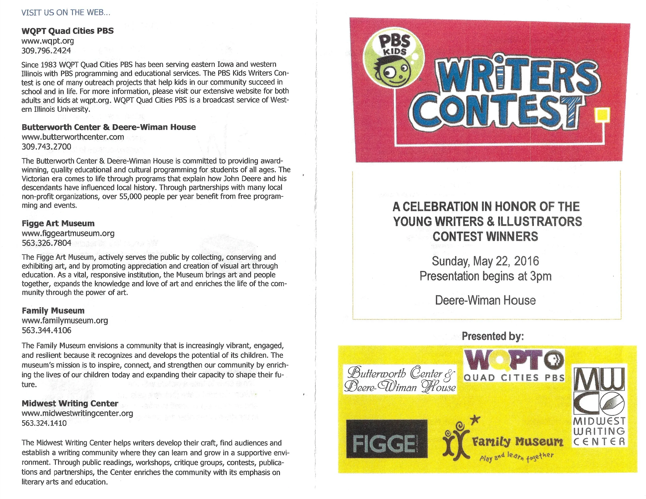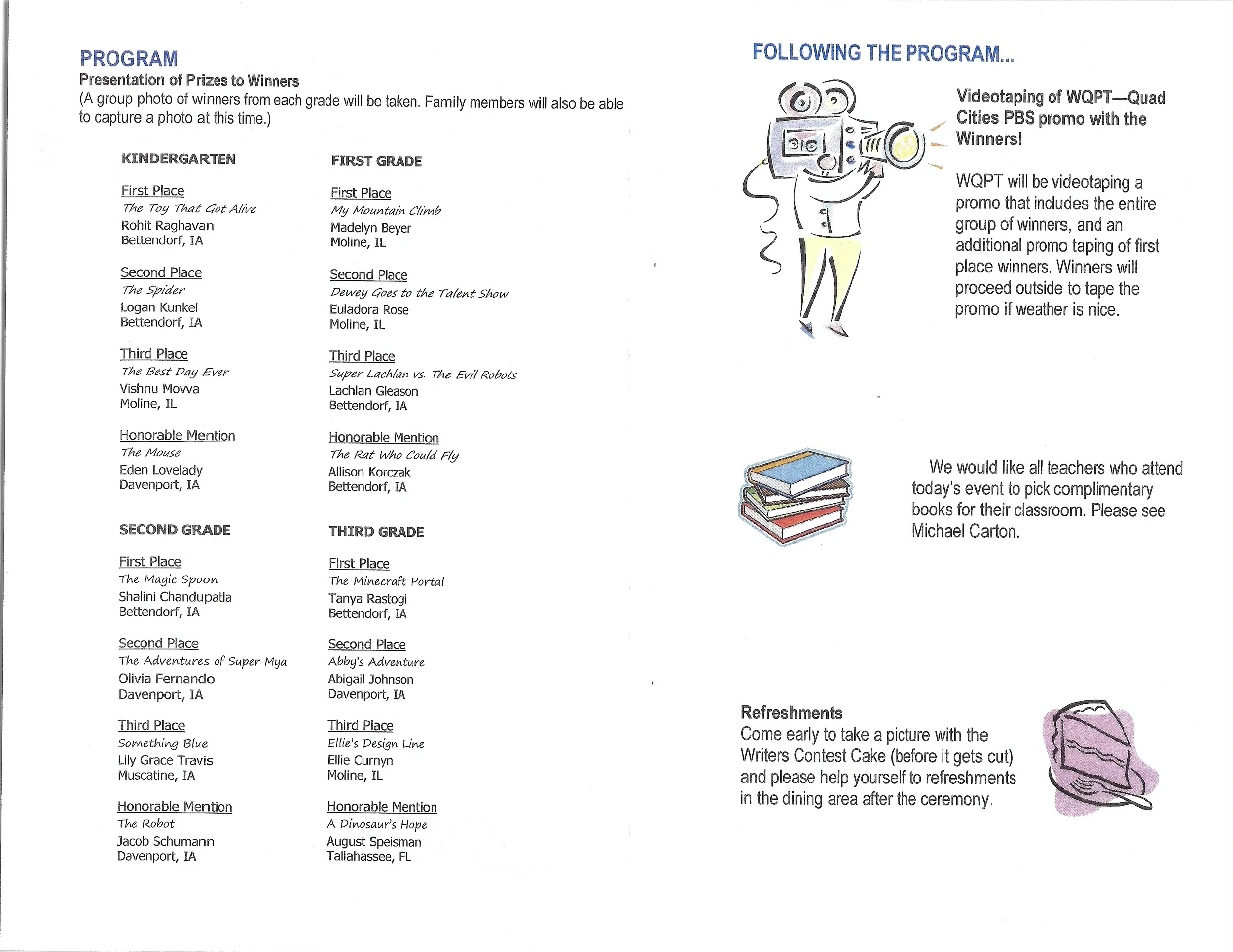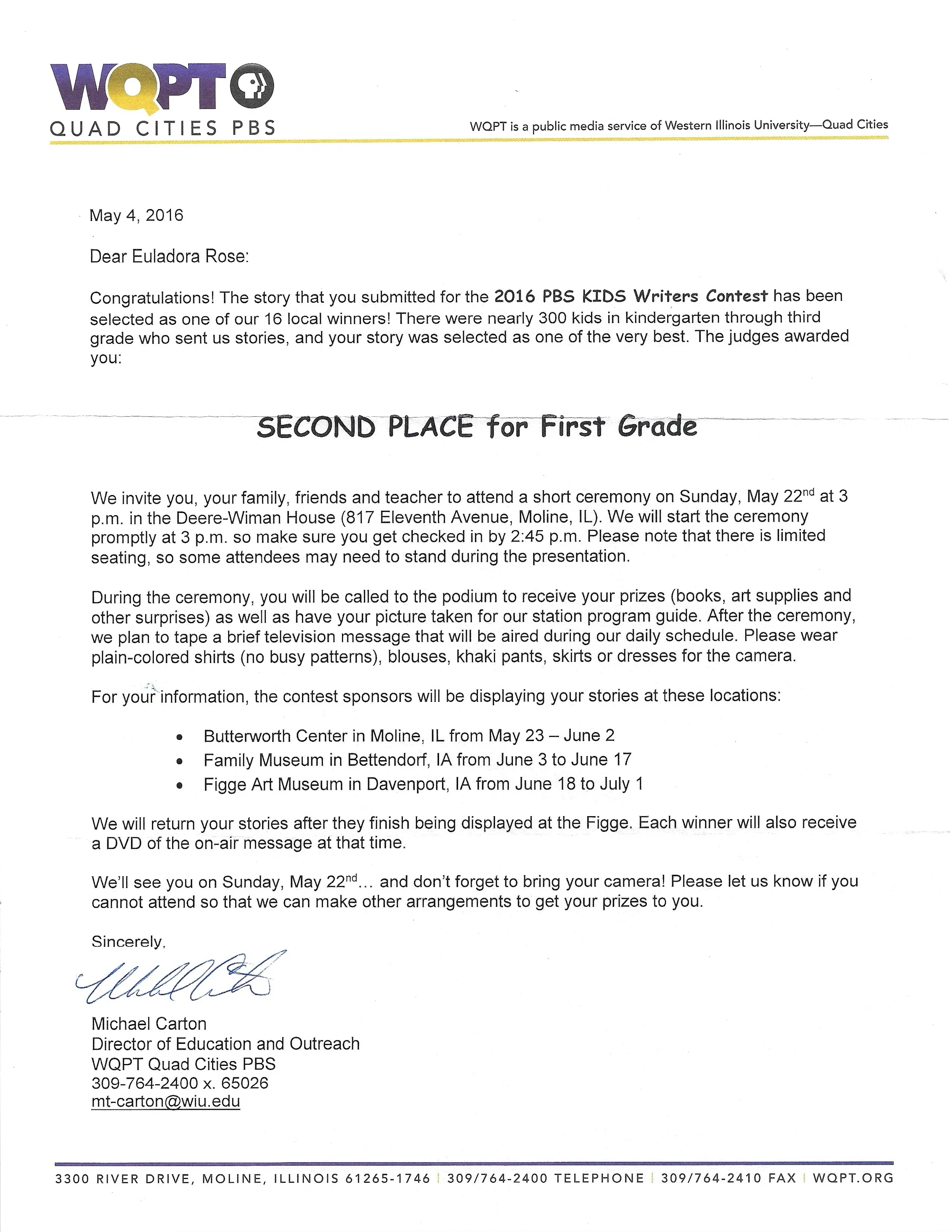 Second Place for 1st Grade Stories submitted to the PBS Kids Writer's Contest, "Dewey Goes to the Talent Show." Award Ceremony at the Deere-Wiman House and exhibition at Butterworth Center, Family Museum of Bettendorf, and The Figge Art Museum. Featured on-air in PBS broadcast. Letter from the Figgie Art Museum.