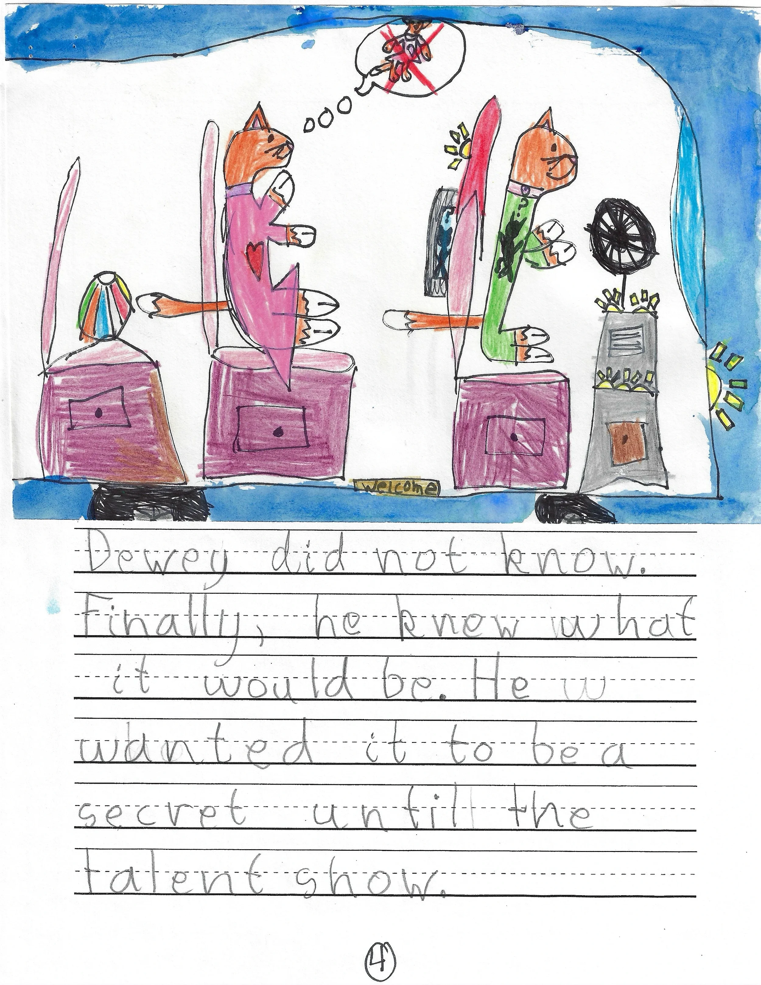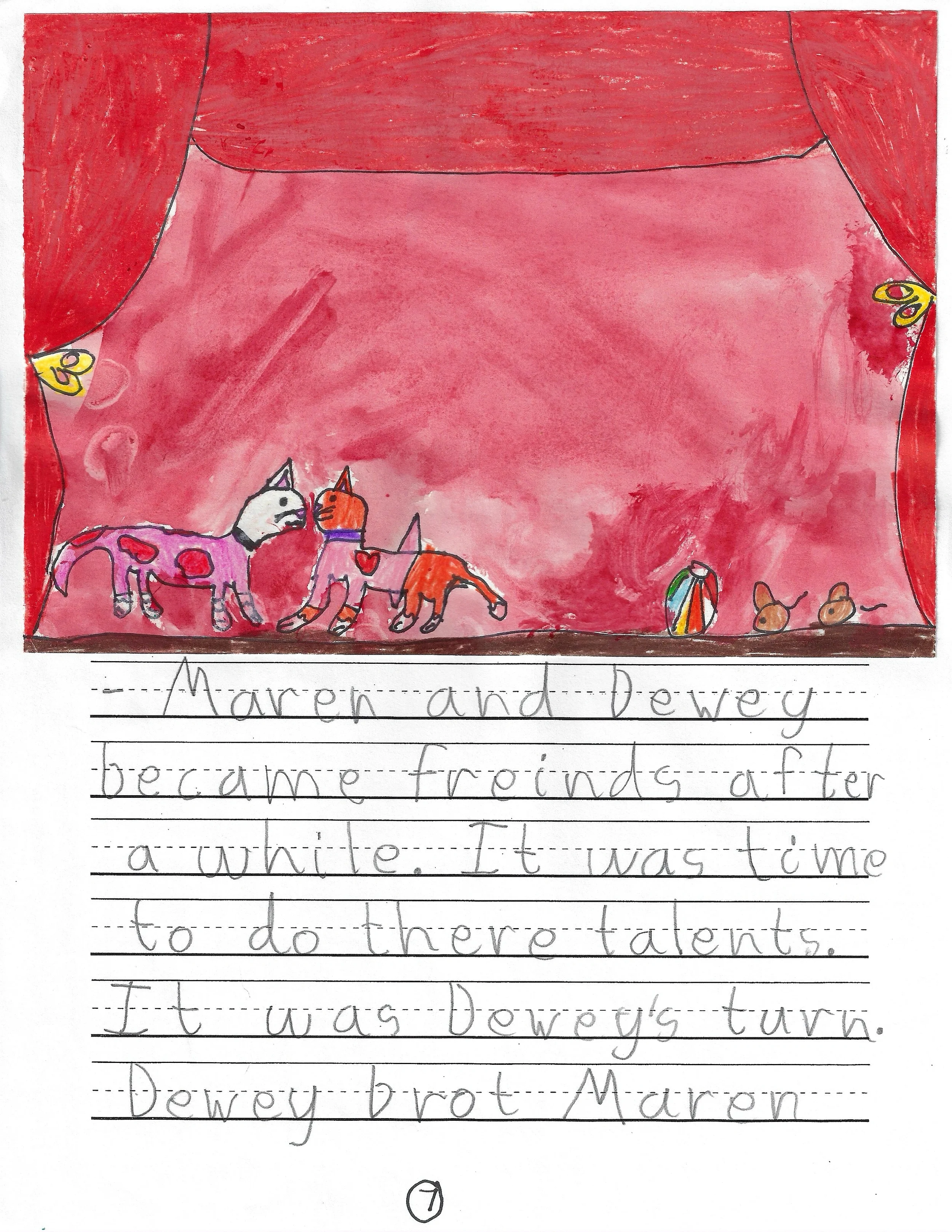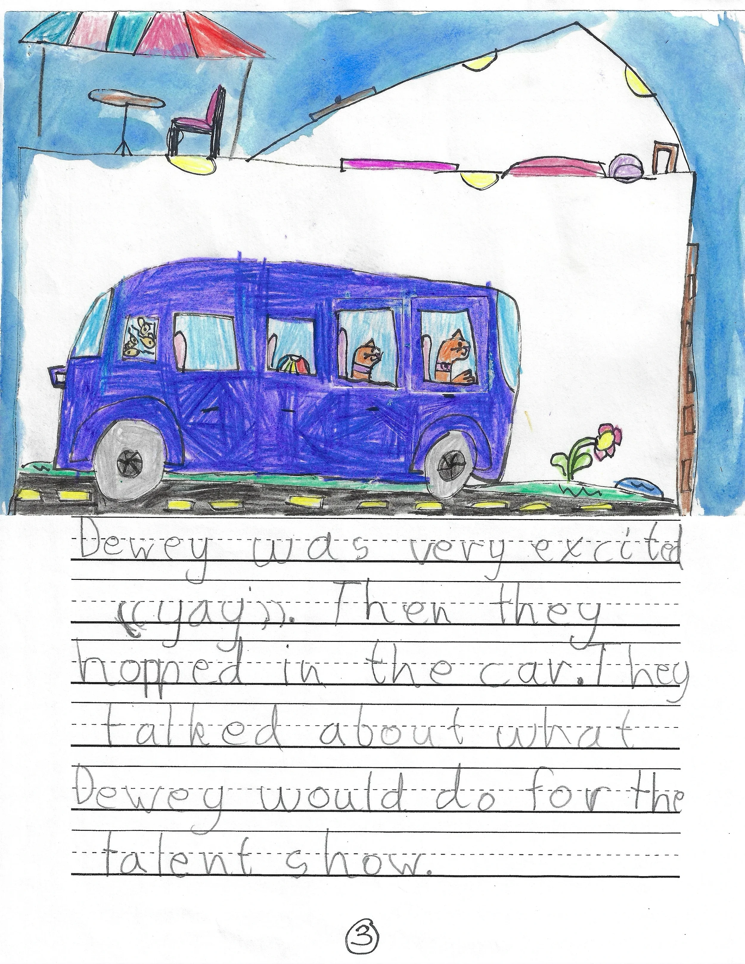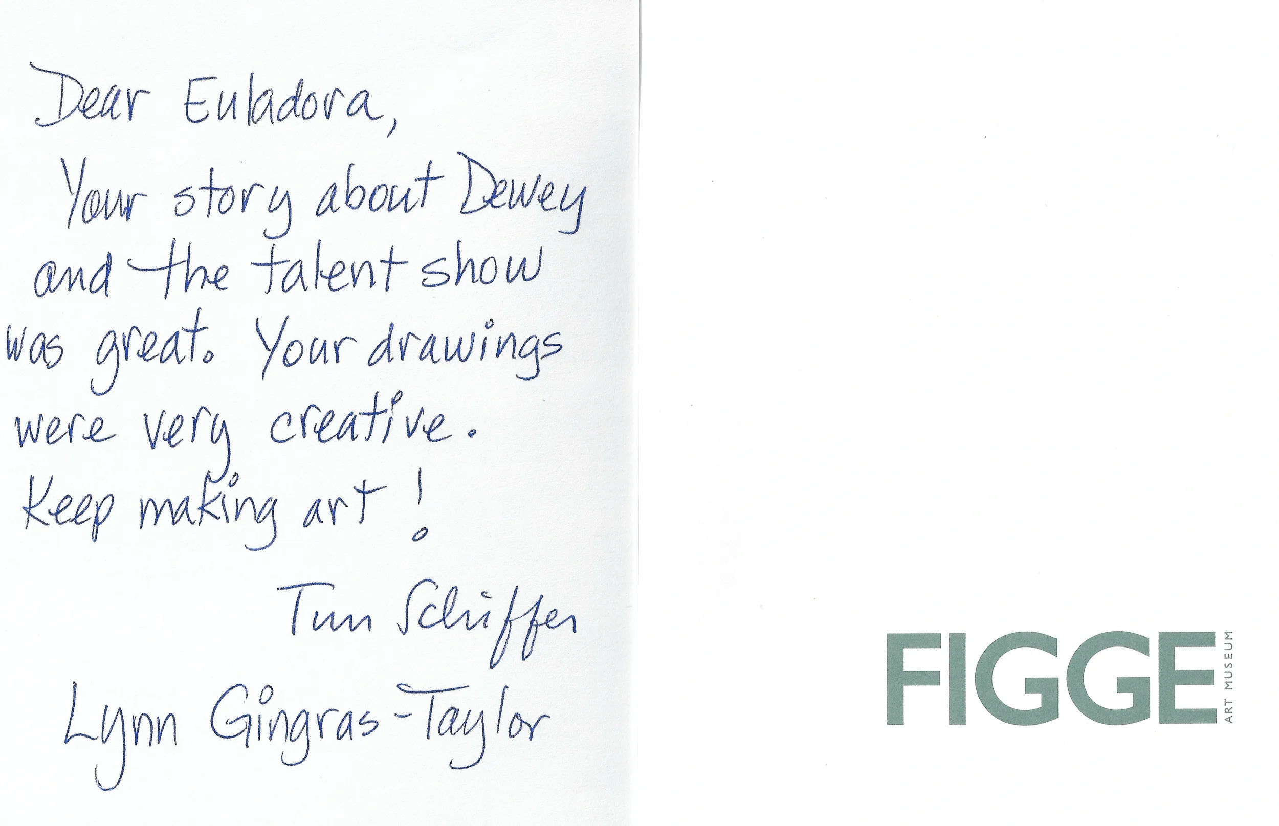 Second Place for 1st Grade Stories submitted to the PBS Kids Writer's Contest, "Dewey Goes to the Talent Show." Award Ceremony at the Deere-Wiman House and exhibition at Butterworth Center, Family Museum of Bettendorf, and The Figge Art Museum. Featured on-air in PBS broadcast. Letter from the Figgie Art Museum.