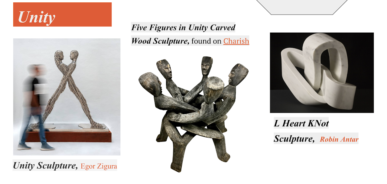 Definition: Unity is separate parts working together in a composition. The sense of cohesiveness between the elements in a composition. The elements shouldn't be exactly the same or completely different but related in some way. Color palettes or similar textures can create a sense of unity between different components. My Unity Sculpture: To symbolize unity I decided to create two abstract human forms hugging. I was inspired by my abstract final sculpture and found it quite interesting to experiment with. I created them so they would fit together perfectly together, complementing one another. My goal for this sculpture was to show unity between one another as humans through forms representative of humans that display how people can work together to creat one, complete, form. One thing that I think I did well was creating abstract human forms. I really enjoy making abstract human forms and I think they are just so fun. One thing I think I could have improved was adding more complexity. I could have created 3-7 different human forms instead of just one and made their unity more complex.