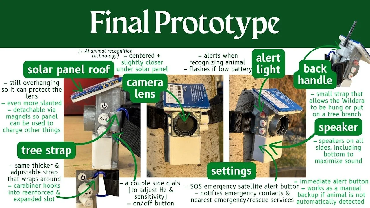 Wildera is a tree-mounted, solar-powered wildlife safety system that combines AI animal recognition, a high-frequency silent deterrent, alert lights, and a built-in SOS satellite emergency button. When wildlife is detected, the device alerts the user and activates deterrents. If needed, an emergency button contacts designated emergency services and personal contacts.